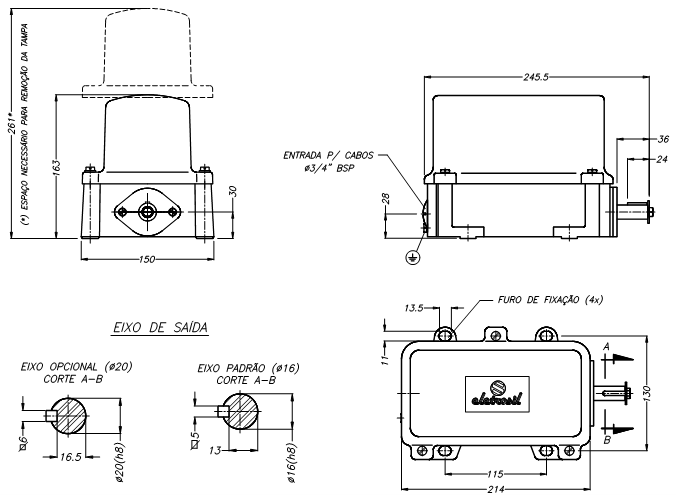Possui duas entradas de cabos de f 3/4” BSP, que podem ser providas de tampões de vedação ou prensa cabos.