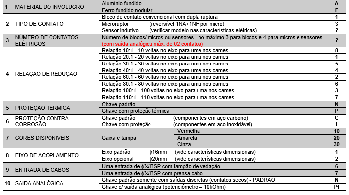 Para uma perfeita especificação do modelo desejado os números entre colchetes, que correspondem aos itens da primeira coluna, deverão ser substituídos pelos códigos alfanuméricos constantes na ultima coluna, ou pelos informados em tabelas anteriores.