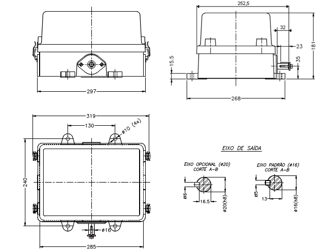 Possui duas entradas de cabos, de f 3/4” BSP, que podem ser providas de tampões de vedação ou prensa cabos.