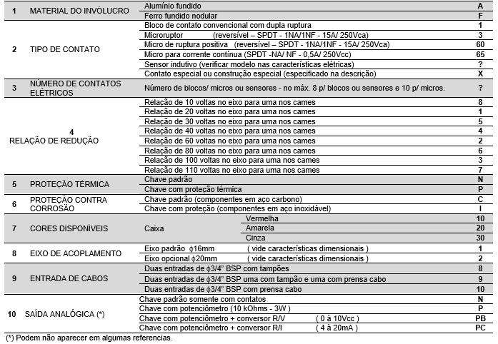 Para uma perfeita especificação do modelo desejado os números entre colchetes, que correspondem aos itens da primeira coluna, deverão ser substituídos pelos códigos alfanuméricos constantes na ultima coluna, ou pelos informados em tabelas anteriores.