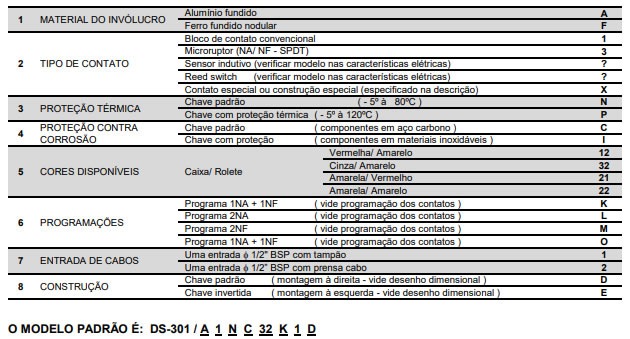 Para uma perfeita especificação do modelo desejado, os números entre colchetes que correspondem aos itens da primeira coluna, deverão