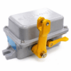 CHAVE PADRÃO – Invólucro, alavanca de acionamento e trava mecânica em alumínio fundido, pintura externa em poliéster (eletrostática a pó), componentes internos e externos em material inoxidável, parafusos da tampa do tipo “imperdível” em aço inoxidável, tampão de vedação ou prensa cabo em plástico e vedações em borracha nitrílica.