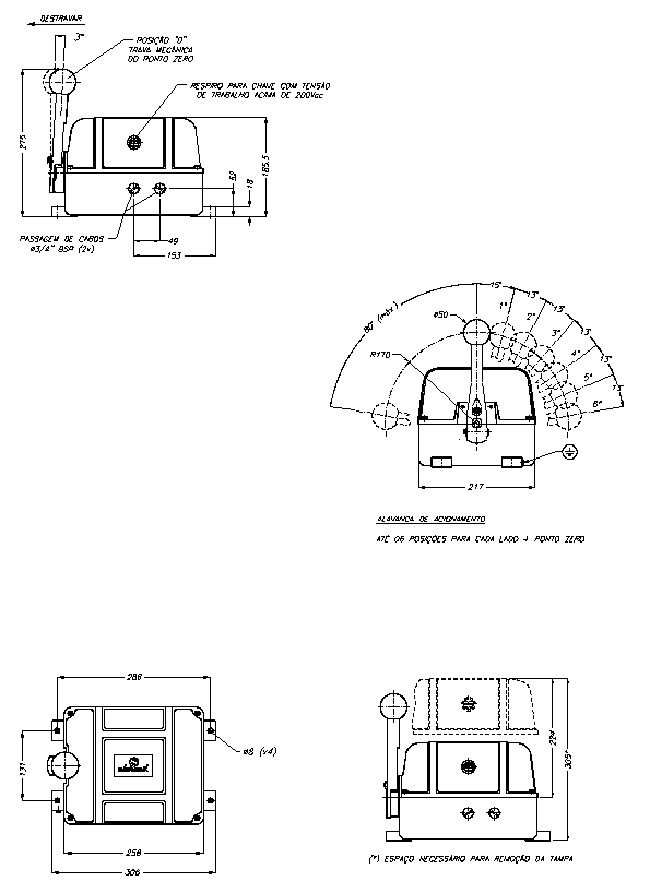 Esta chave possui até 6 (seis) posições da alavanca para cada lado de atuação, mais a posição zero, ajustado através de batente aparafusado na coroa posicionadora, e até 14 blocos de contatos individuais com fechamento programado através de cames metálicos (um came para dois contatos), conforme diagrama fornecido pelo cliente.