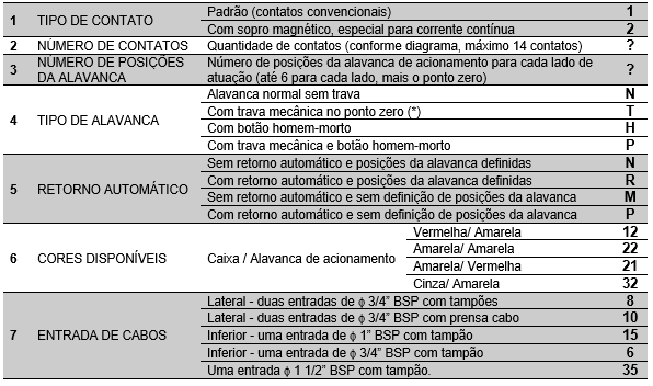 Para uma perfeita especificação do modelo desejado os números entre colchetes, que correspondem aos itens da primeira coluna, deverão ser substituídos pelos códigos alfanuméricos constantes na ultima coluna.