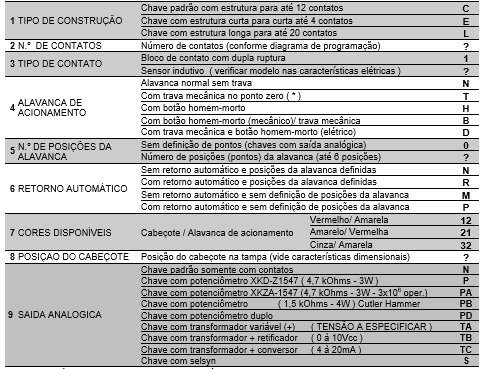 Para uma perfeita especificação do modelo desejado os números entre colchetes, que correspondem aos itens da primeira coluna, deverão ser substituídos pelos códigos alfanuméricos constantes na ultima coluna, ou pelos informados em tabelas anteriores.