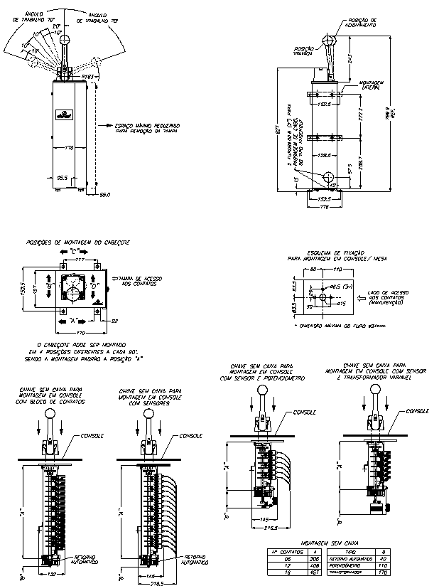 Esta chave possui até 6 (seis) posições da alavanca de acionamento para cada lado de atuação mais a posição zero, e até 16 blocos de contatos ou sensores indutivos, programados através de cames metálicos, conforme diagrama fornecido pelo cliente.