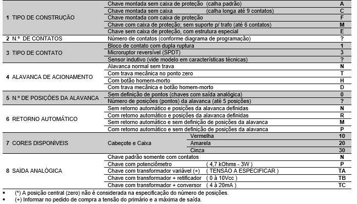 Para uma perfeita especificação do modelo desejado os números entre colchetes, que correspondem aos itens da primeira coluna, deverão ser substituídos pelos códigos alfanuméricos constantes na ultima coluna, ou pelos informados em tabelas anteriores.