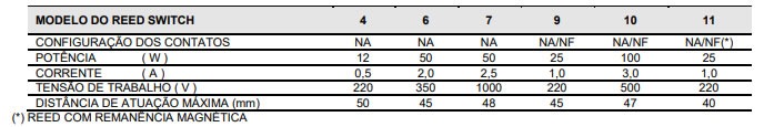 A programação dos contatos atende as especificações dos reed’s, conforme constam na tabela de características técnicas, para programações