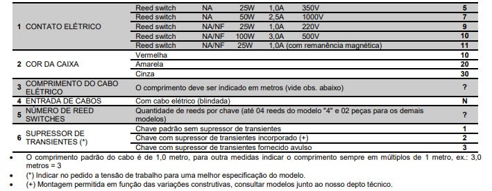 Os contatos elétricos são do tipo reed switch (ampola de vidro com atmosfera inerte e contatos com revestimento em ouro ou Rhódio), com