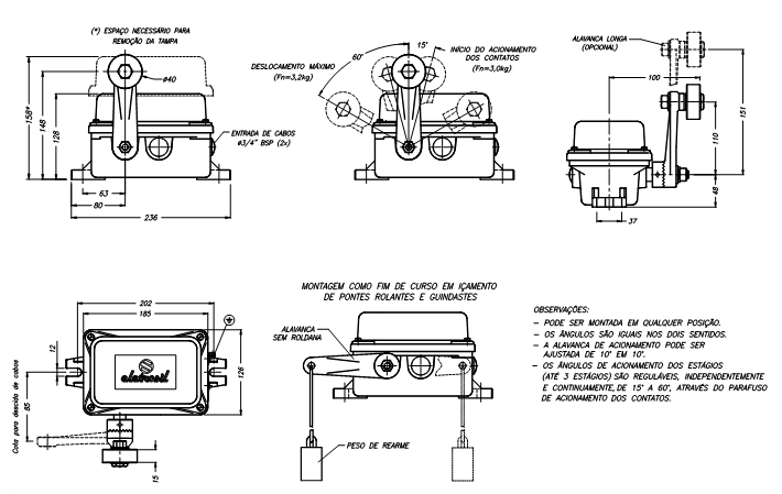 Chave fim de curso para serviço pesado do tipo “alavanca com roldana”, com acionamento em uma direção e dois sentidos, com retorno automático, e até 3 estágios de atuação dos contatos, especialmente projetada para operar em ambientes agressivos.