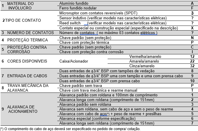 Para uma perfeita especificação do modelo desejado, os números entre colchetes que correspondem aos itens da primeira coluna, deverão ser substituídos pelos códigos alfanuméricos constantes na ultima coluna, ou pelos informados em tabelas anteriores.