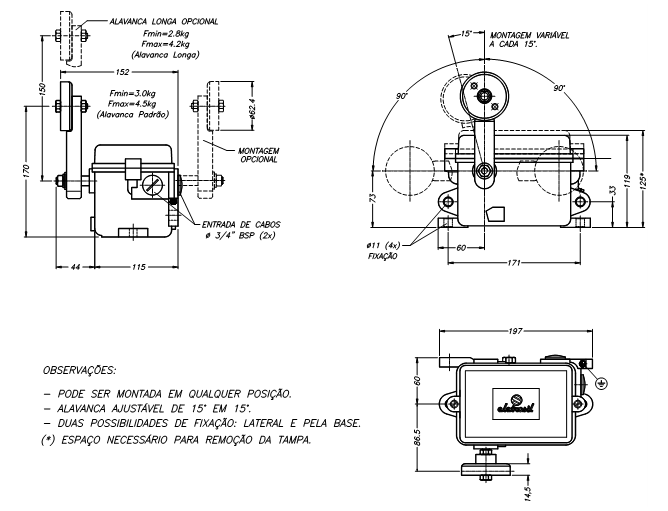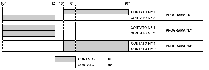 Os ângulos indicados no diagrama são referentes ao deslocamento da alavanca de acionamento, sendo que a mesma poderá ser ajustada de 0º à 360º de 15º em 15º, outras programações deverão ser consultadas.