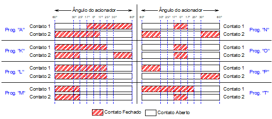 Os ângulos indicados nos diagramas são referentes ao deslocamento do acionador, e todos os pontos de atuação podem ser alterados em mais ou menos 45º através de relocação dos cames (possuem 6 posições distintas).