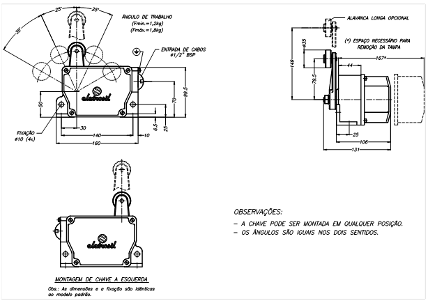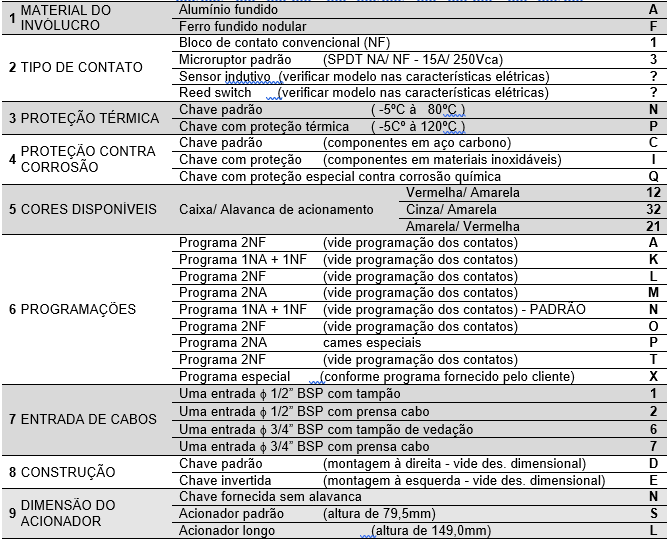 CHAVE PADRÃO: Invólucro e acionador em alumínio fundido, pintura em poliéster (eletrostática a pó), componentes internos em aço carbono bicromatizado, parafusos da tampa do tipo “imperdível” em aço inoxidável, vedações em borracha especial, buchas do eixo em bronze, blocos de contatos e cames em baquelite, contatos elétricos em latão com pastilhas de AgCdO.