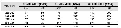 • Para chaves duplas considerar a potência indicada como individual para cada motor.
