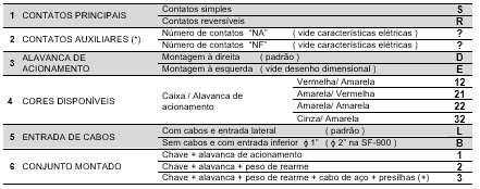 Para uma perfeita especificação do modelo desejado, os números entre colchetes, que correspondem aos itens da primeira coluna, deverão ser substituídos pelos códigos alfanuméricos, constantes na ultima coluna, ou pelos informados em tabelas anteriores.
