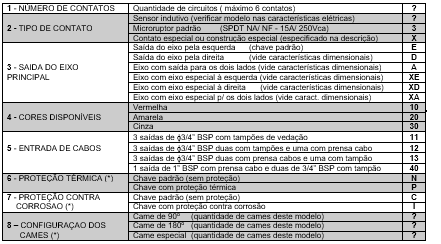 Para uma perfeita especificação do modelo desejado, os números entre colchetes que correspondem aos itens da primeira coluna, deverão ser substituídos pelos códigos alfanuméricos constantes na ultima coluna, ou pelos informados em tabelas anteriores.
