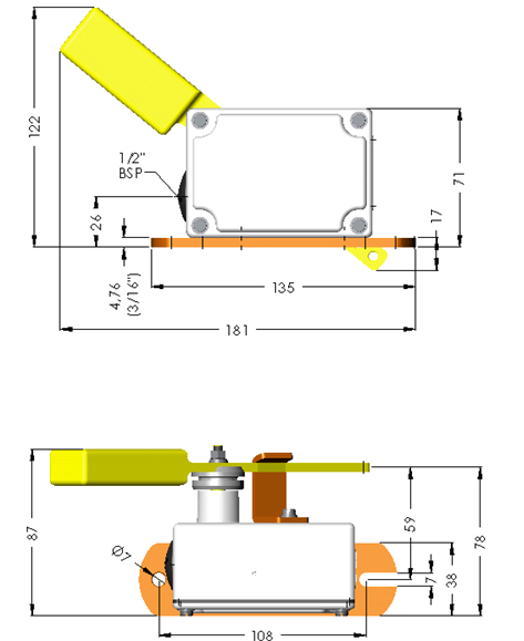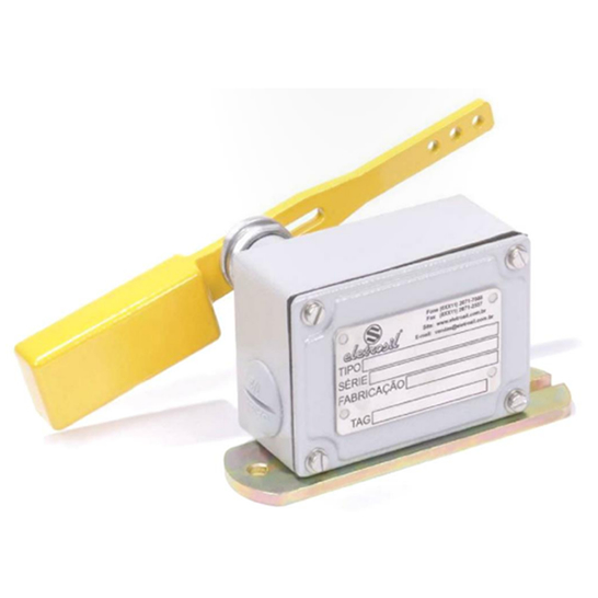 Chave fim de curso de acionamento por contrapeso, com 01 contato de ação instantânea utilizada como “limite de emergência”, com atuação em circuitos de comando em corrente alternada.