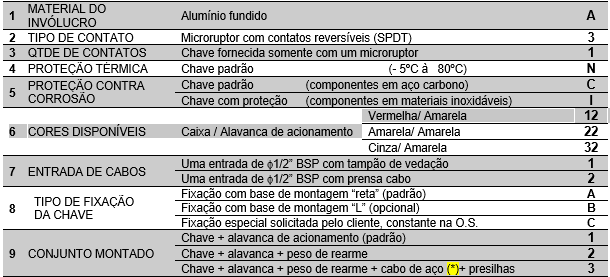 CHAVE PADRÃO: Caixa e Tampa em alumínio fundido, pintura externa eletrostática a pó, eixos e componentes em aço carbono (molas em aço inox), parafusos da tampa do tipo “imperdível” em aço inox, contato elétrico tipo microruptor de ação instantânea e buchas dos eixos em bronze especial.