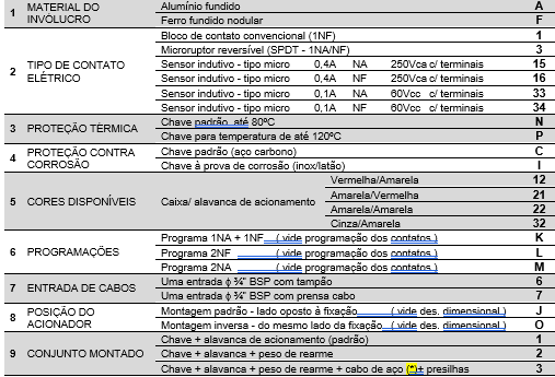 Para uma perfeita especificação do modelo desejado os números entre colchetes, que correspondem aos itens da primeira coluna, deverão ser substituídos pelos códigos alfanuméricos constantes na ultima coluna, ou pelos informados em tabelas anteriores.