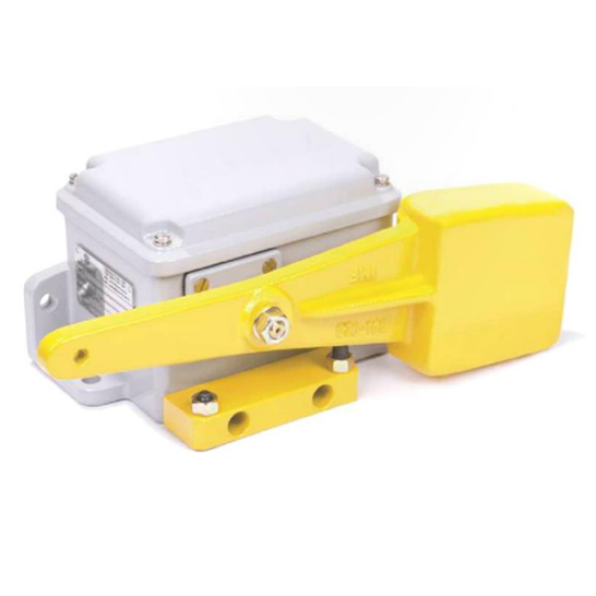 Chave fim de curso de acionamento por contrapeso, com 02 contatos de ação instantânea utilizada como “limite de emergência”, com atuação em circuitos de comando em corrente contínua ou alternada, principalmente em acionamentos com inversores de frequência