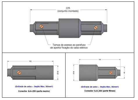 Conector unipolar, composto por duas partes sendo “macho” e “fêmea”, construídos em borracha especial, com alto grau de proteção dos terminais, indicados para uso em eletroimãs em pátios de sucata ou de produtos siderúrgicos. Devido a sua grande resistência mecânica e sua estanqueidade na conexão é indicado para uso externo em siderúrgicas.