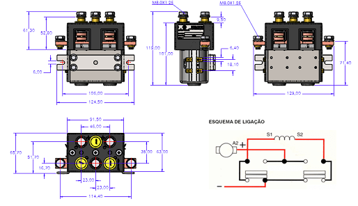 Contator de unipolar reversível para uso em corrente contínua, indicado para acionamento de veículos elétricos tais como carros e empilhadeiras elétricas.
